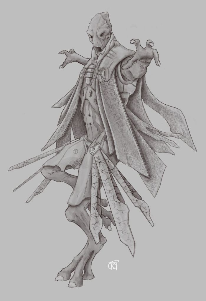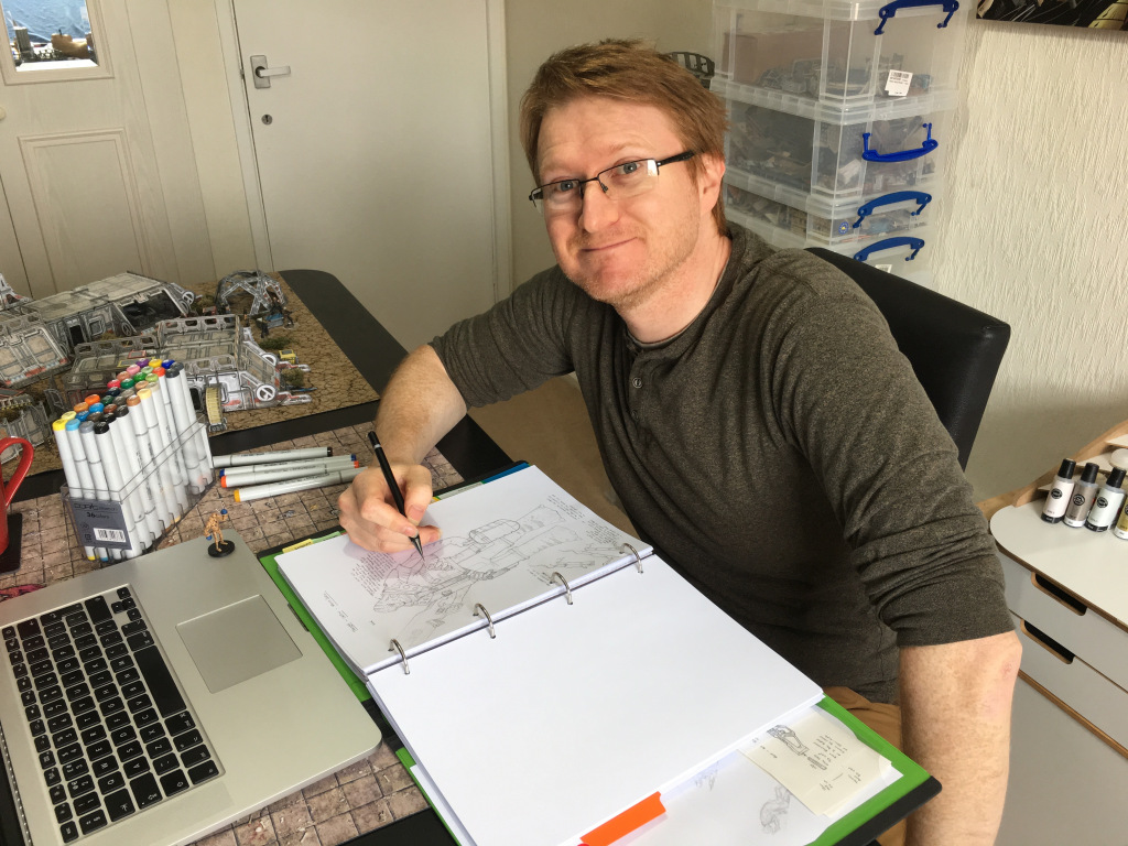 It started with sketches of aliens. I always start with the characters. If they don’t look interesting and cool then it doesn’t matter who they are or where they come from. Also I find that adding the armour, weapons and tech tend to tell me where they come from and inform their story.