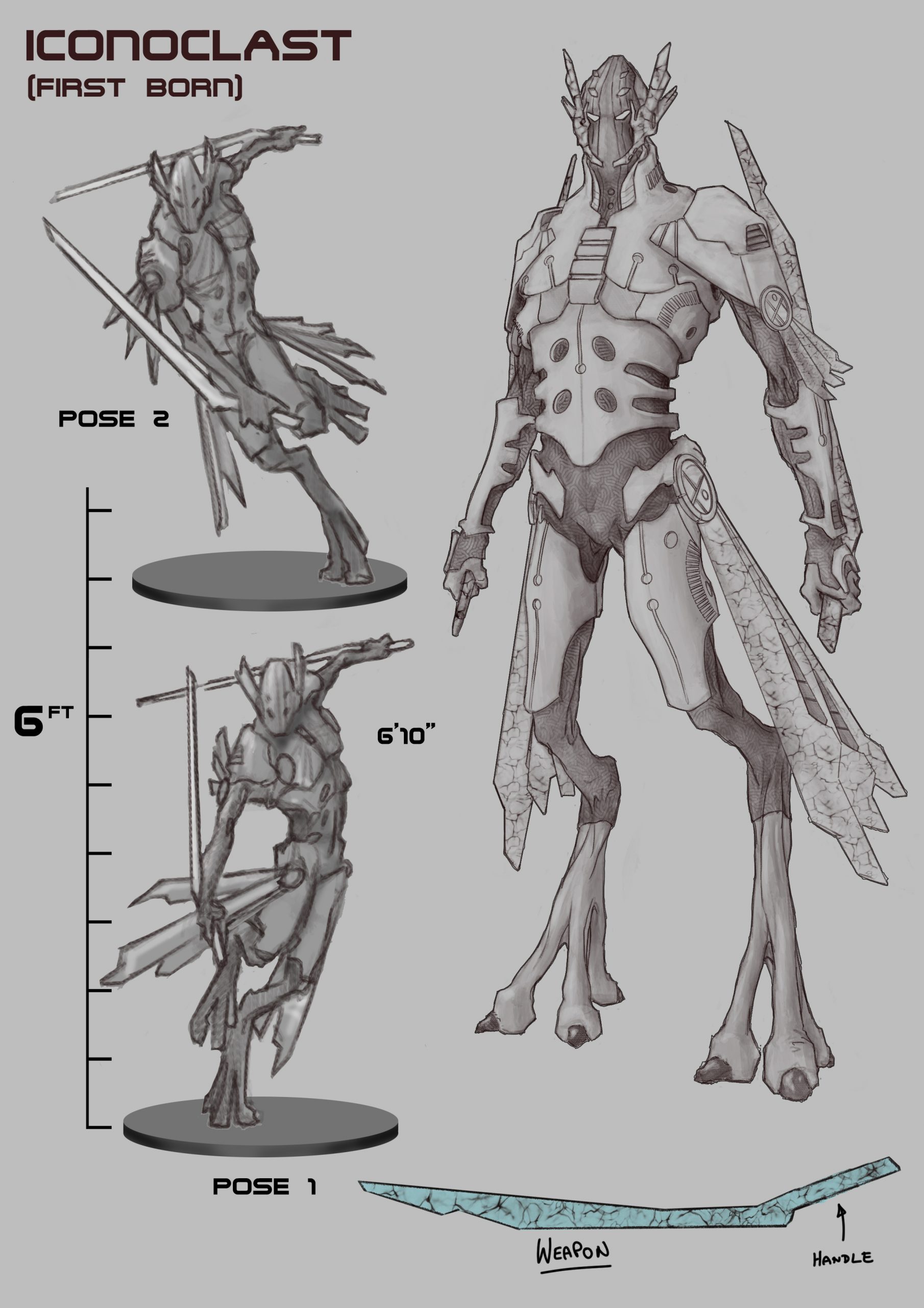 The design language of the characters was always clear in my head, but getting it on paper is always the challenge. I wanted scary, but wise… Strong and powerful, but lean and elegant… Ancient, but high tech… Weapons, but no guns as such… Ornamental and symbolistic, but also practical… This is always the constant battle with every character and the adornment you give them. With the design language you tend to lean on specific shapes to convey characters and objects. Squares are strong and reliable (think big trucks and heavy loaders, oxen), circles are often friendly and approachable, (think VW Beetle, baby faces, owls) and triangles convey speed, sharpness and danger, (think fighter jets, super cars, wolves and foxes). So keeping this in mind I subconsciously pulled in triangles to convey the speed and power, with some circles for counter balance for form to show the First Born are not just about offensive and aggressive mind-sets. I tried to stay away from squares so the feel of the characters was focused and not confusing.