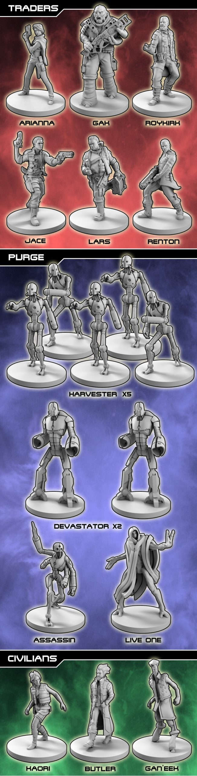 Speaking of FREE (the capitals are a running joke if you wondered) 😉 we also have bonus minis for our core backers, minis that aren’t in the retail box but will be FREE to our backers, including two criminal gang members, Hobb and Chunk, two Galactic guards, each in a different pose and four harvester Purge, the foot soldiers of the creepy synthetic species out to get you!