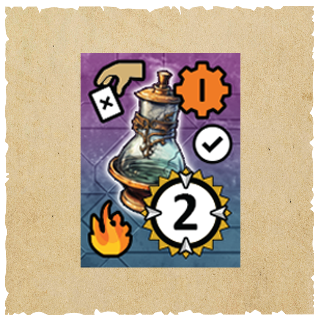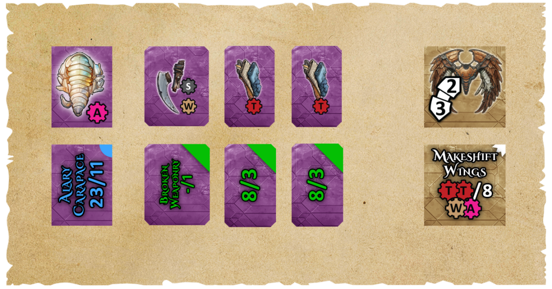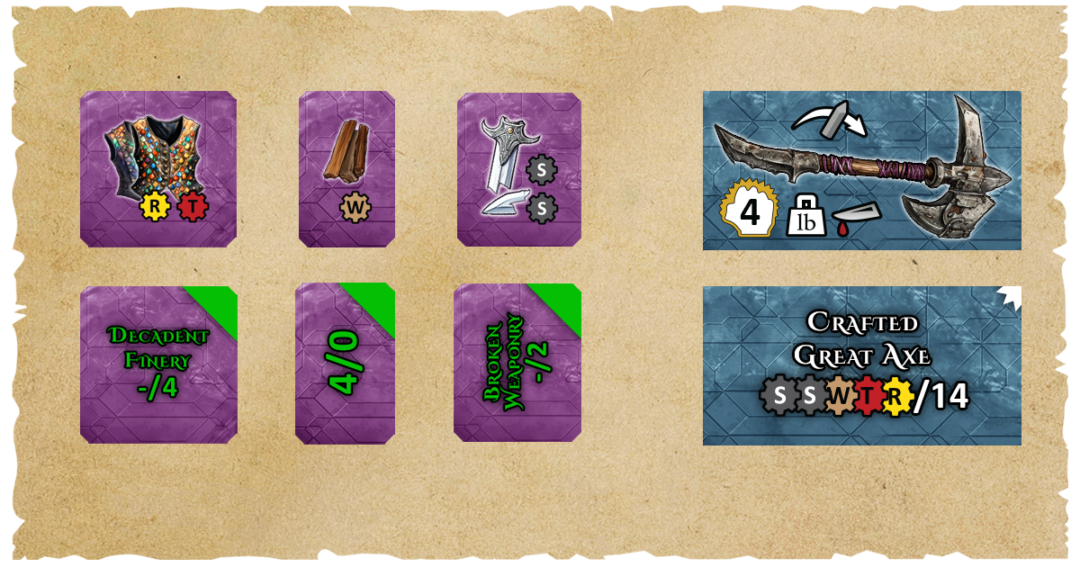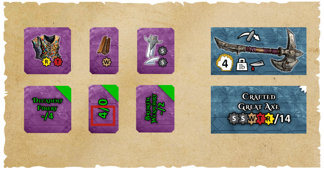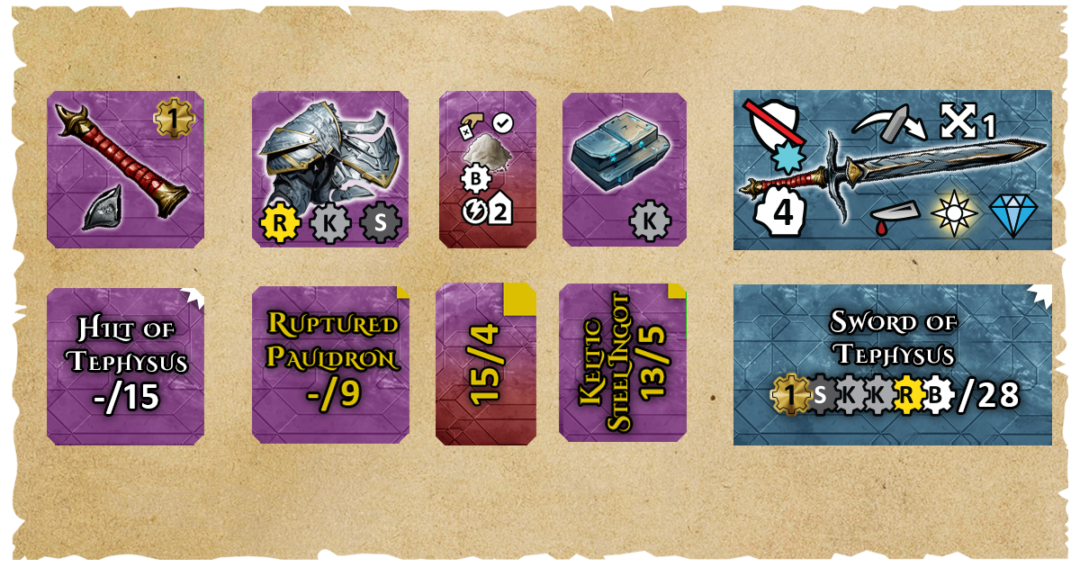 If we hadn’t found the Wood token in the dungeon, we could have purchased it from the Artisans Guild for a small fee, increasing the total crafting cost to 18 Guilders and still discarding all of the resource tokens after use.