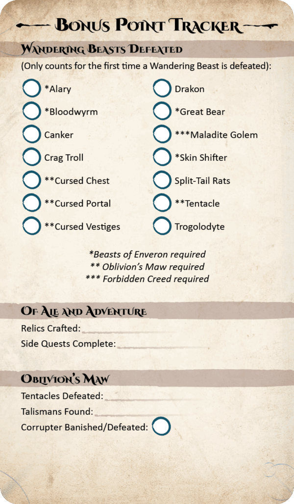 The Maladum Dungeons of Enveron campaign comes with a campaign log to keep track of important information as you progress through the story. As it happens, this also makes for a useful tracker to see how well you are doing overall.