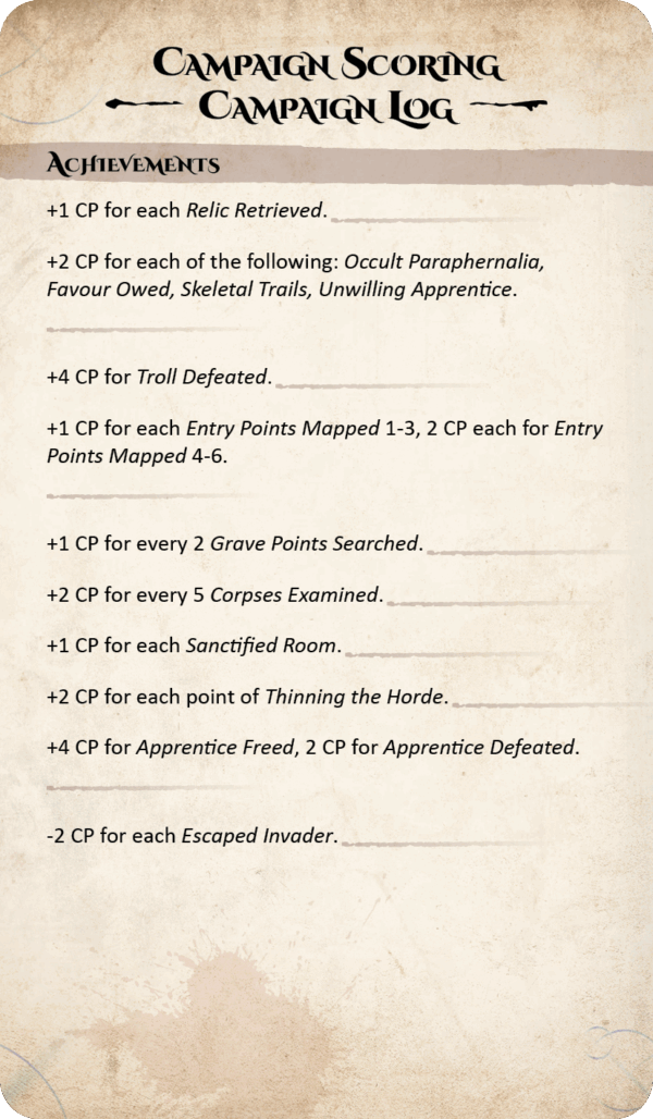 Below you will find a scoring system that uses the campaign log (and a few extra bits of information) to determine just how mighty your band of Adventurers truly are.