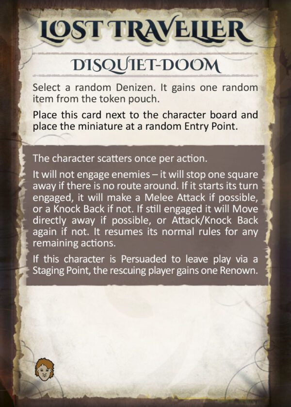 Most of the time, drawing the card will bring a Denizen into play, tell you what type they are and list how they will act. This means that you can place the card next to the Denizen’s board and it acts as a reminder of what their goals and actions are. Not only is this convenient for you but it also allows us to create an unlimited variety of characters and goals without needing a new rulebook.