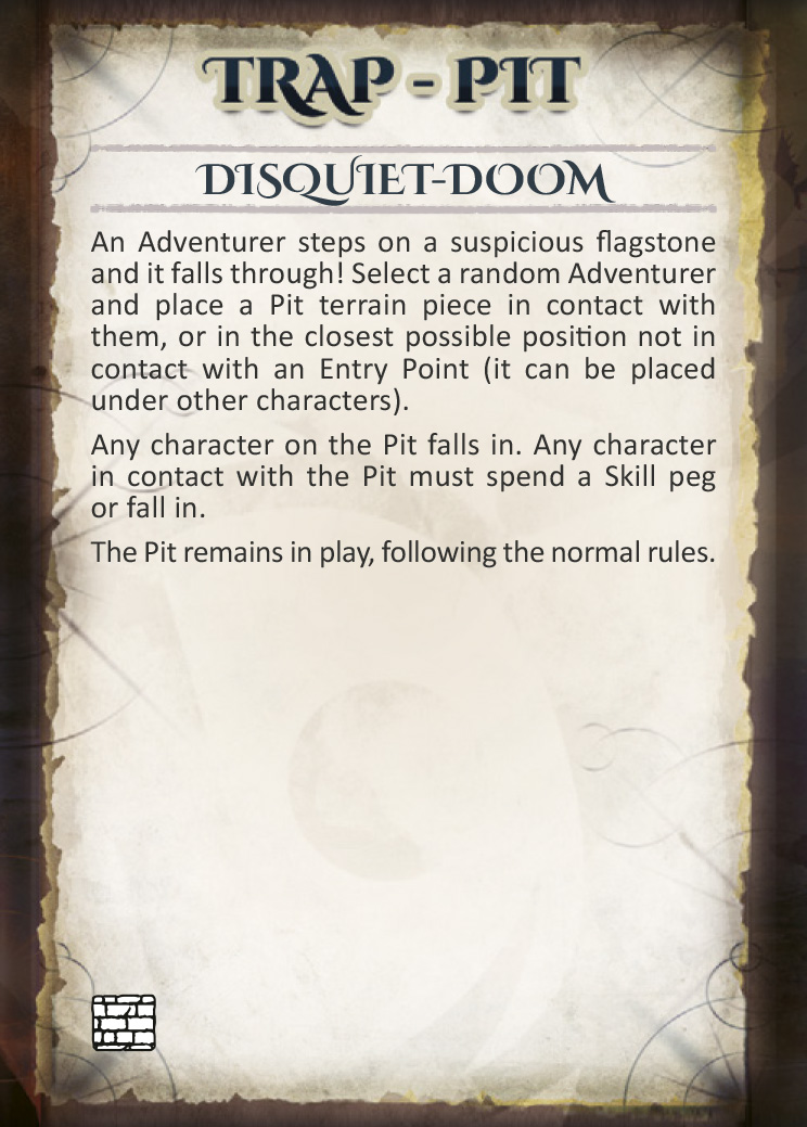 No dungeon is complete without traps and the pit trap never goes out of fashion, triggered by the Trap – Pit card it’s sure to test your characters. It also comes with a cool terrain piece to mark its location when triggered – shame that wasn’t there when you stepped on it.