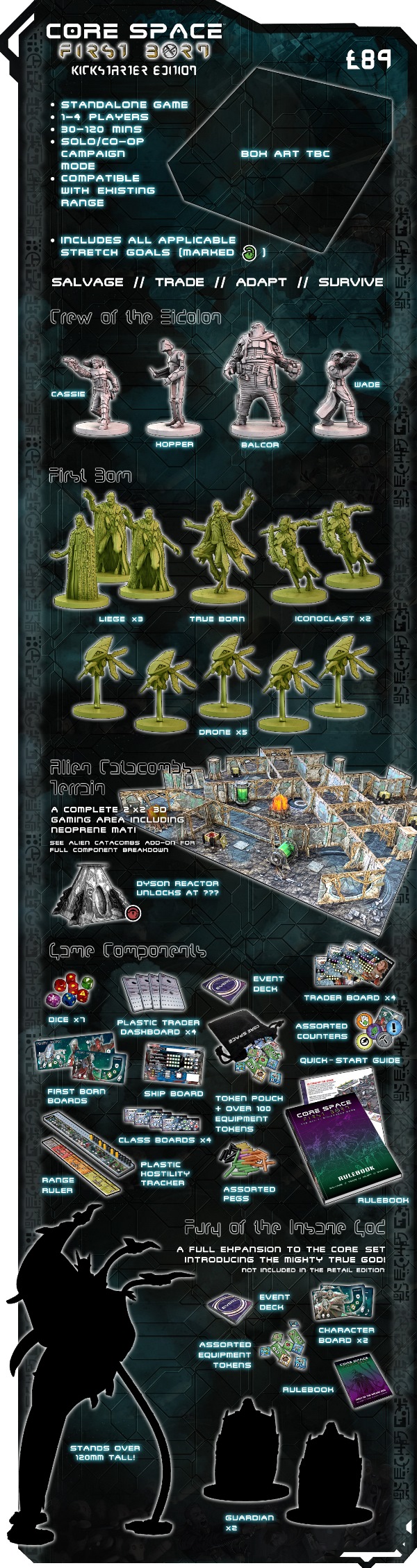 The Kickstarter for Core Space: First Born will be launching on October 28th and running for around three weeks, with a plan to deliver in autumn 2021. So, that’s when, but what do you get? The following image is still work in progress but we think it’s pretty awesome already!