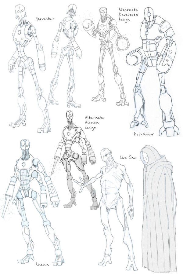 So why are the Purge so creepy? The Purge could easily be a standard robot army, or a criminal gang, or religious fanatics and work just as well in the game as the main protagonists. The reason is simple: I didn’t find them scary. Colin had designed all of the main Purge, the Harvesters, Devastators, Assassin and Live One and I thought that they all looked kind of endearing, even goofy. Out of context the Purge could be any sort of industrial robot, in the background, just working Joes, harmless. So I made sure the actual context was horrible!