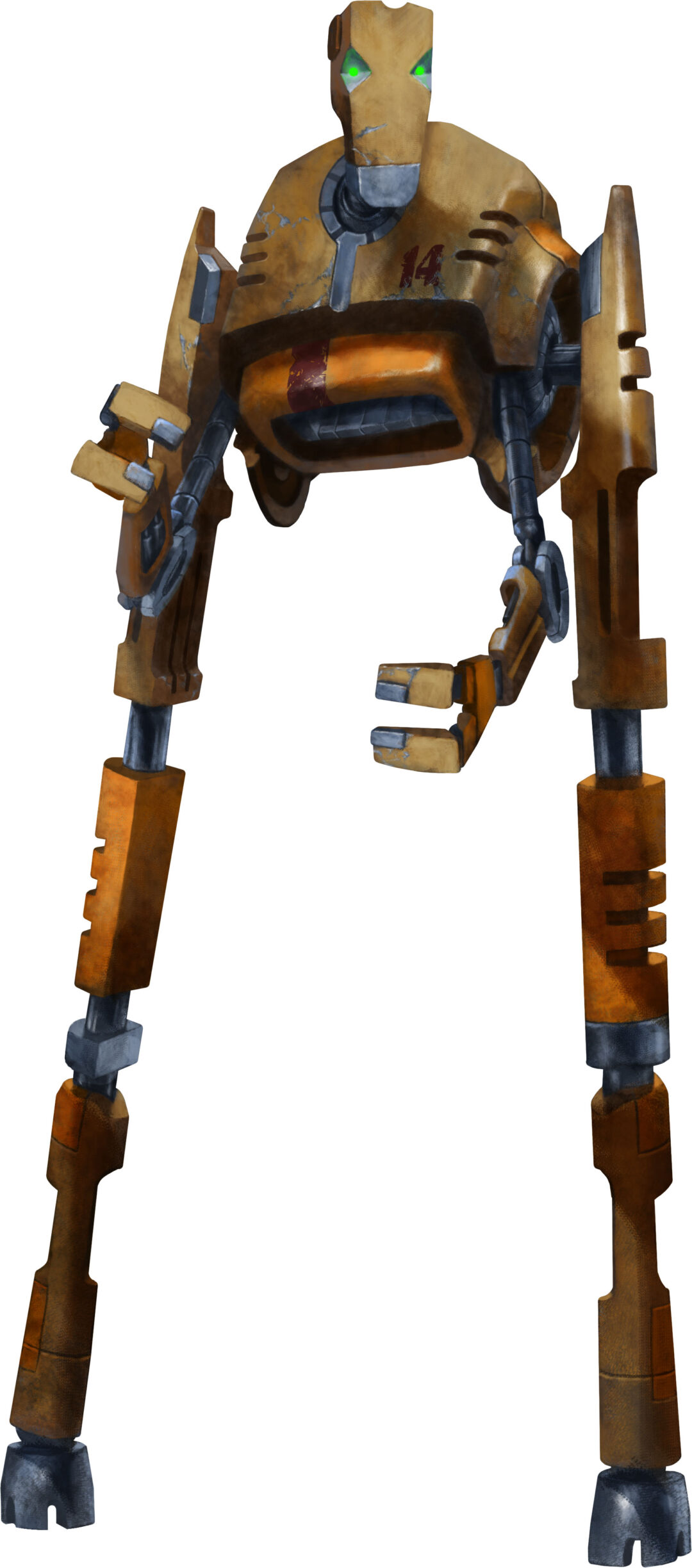 Stilts was a packing droid whose only purpose was to work 24 hours a day in a large warehouse. A heavy package falling off a high shelf onto its cranium ensured that Stilts would leave that life, wandering out into the night and ending up in the local woods where it stayed for several months. A scrap merchant found it with nearly all its charge depleted and instead of returning it to the warehouse repaired and sold the machine to a passing Trader. Stilts now serves as a staff member at Trading Post 5 and is content to follow all orders, as anything is better than the warehouse.