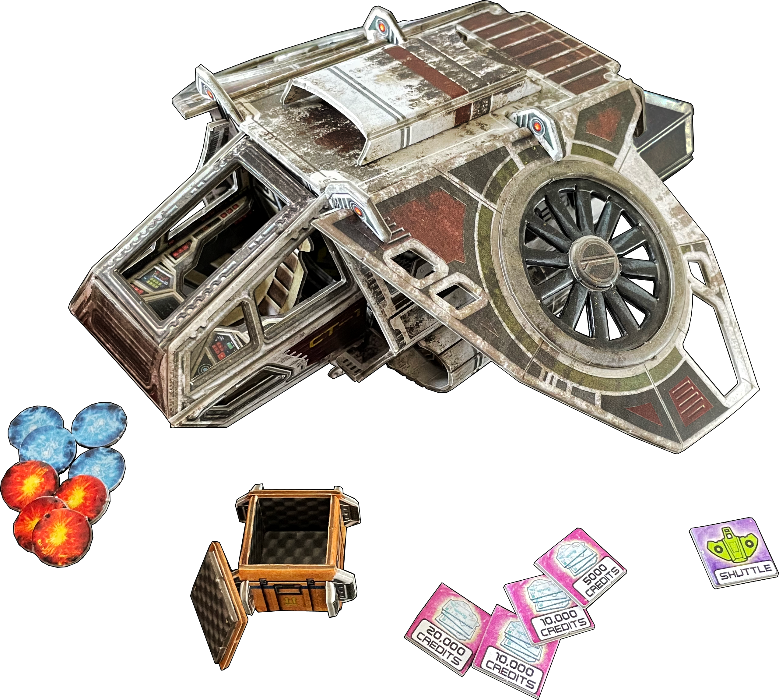 This mini expansion for Core Space introduces the Patrol Class Shuttle, a Galactic Corps craft designed for high speed manoeuvrability in atmospheric pursuits. Now decommissioned, it is a solid, reliable craft popular with Traders. The shuttle makes it much easier to extract your crew from a tight spot or get around between games. The two thrilling new missions see you rebuild one of these shuttles from scrap and assist with an evac mission from a remote First Born temple.