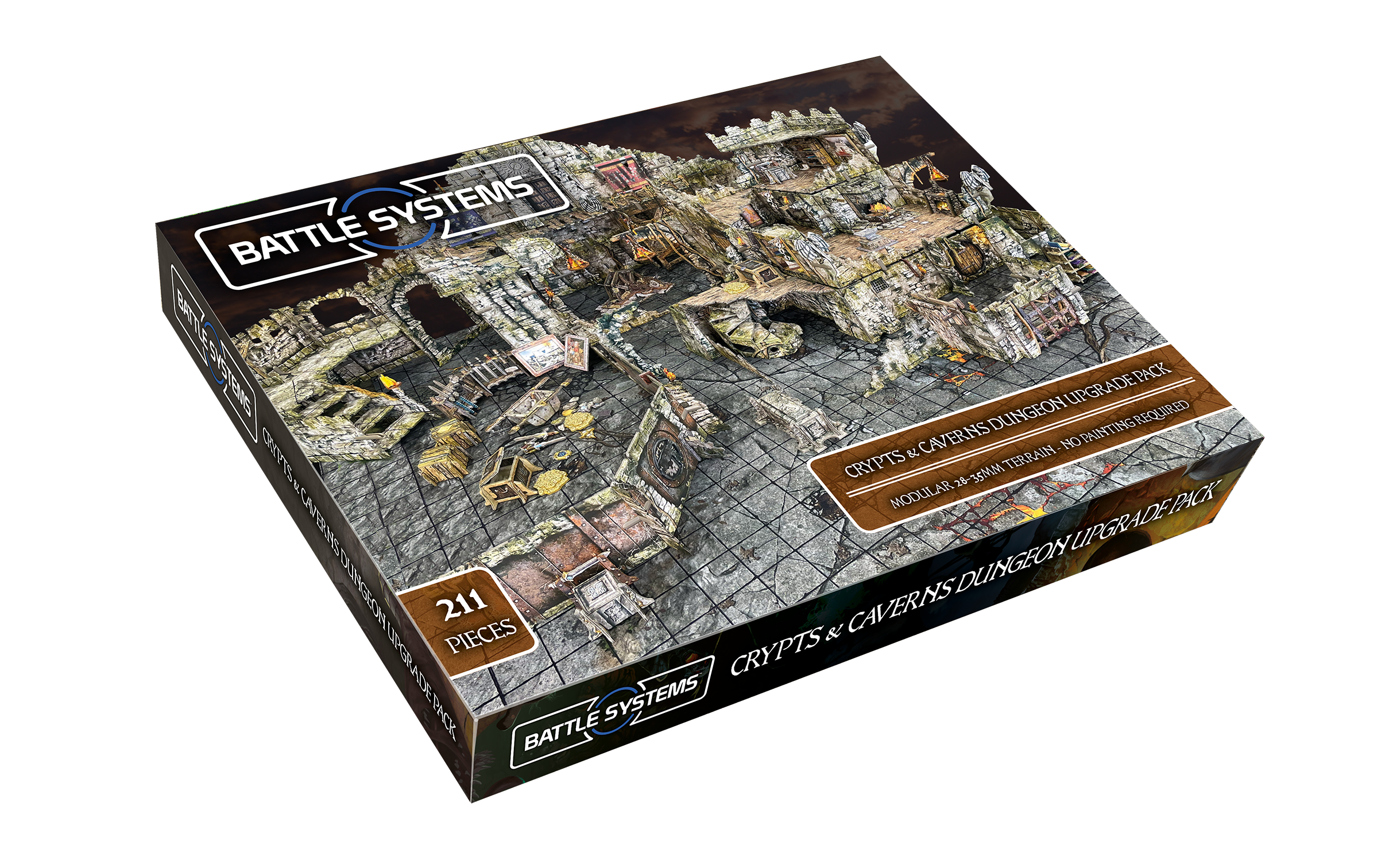 This Crypts and Caverns Dungeon Upgrade Pack expands your Battle Systems Dungeon with unique walls, floors, furniture and accessories not found in the core set. These can add variety to your dungeon or castle layouts, build towering multi-level sections, or create bespoke rooms to suit your quest objectives.