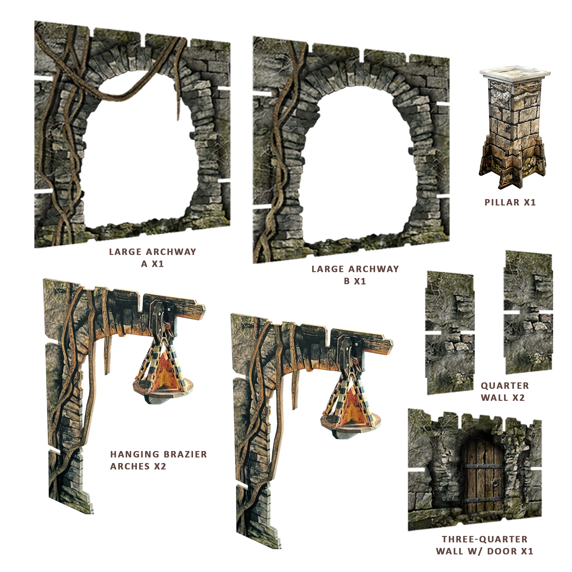 This pack contains additional archways and other accessories from the Fantasy Dungeon terrain set for building larger gaming areas.