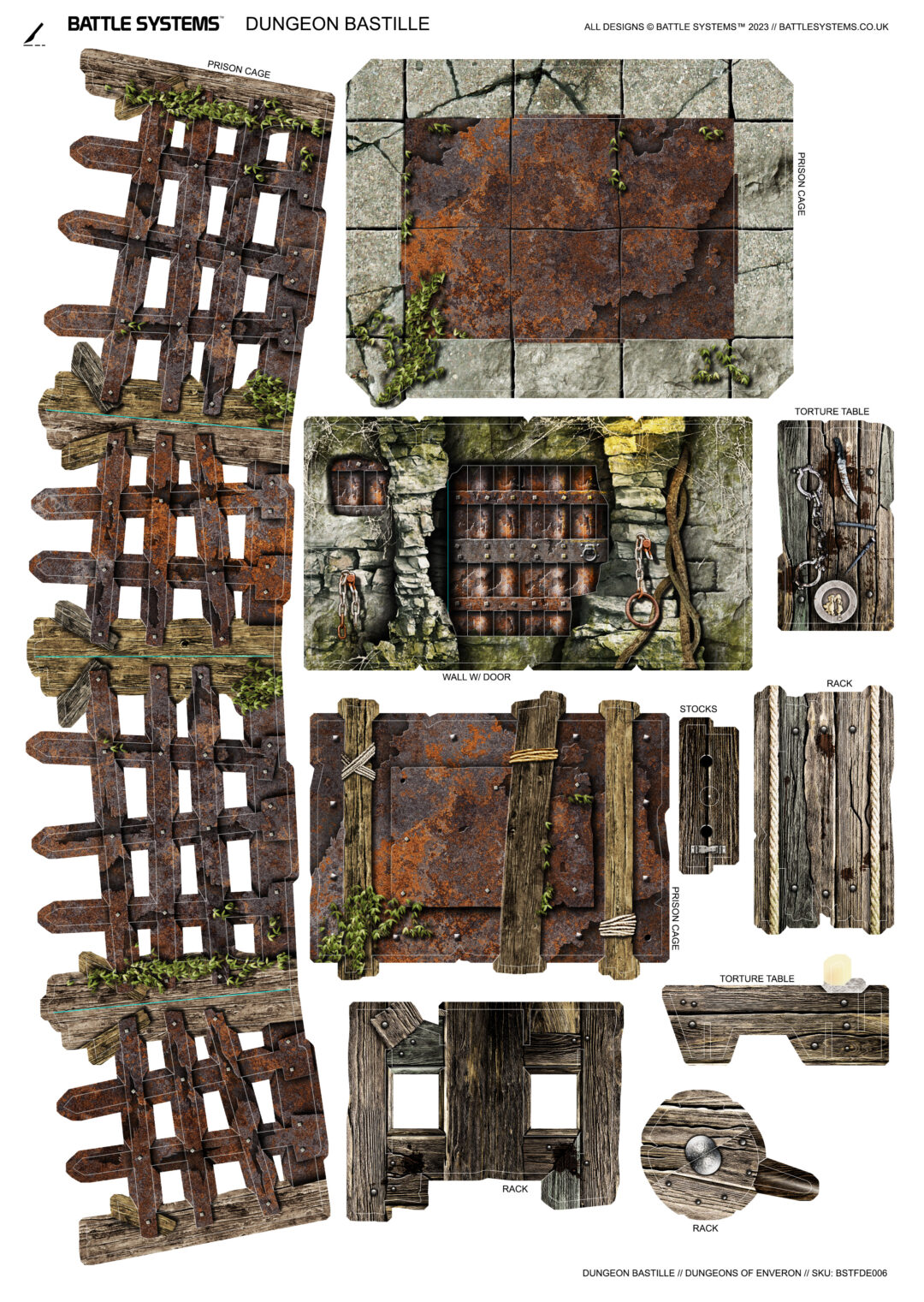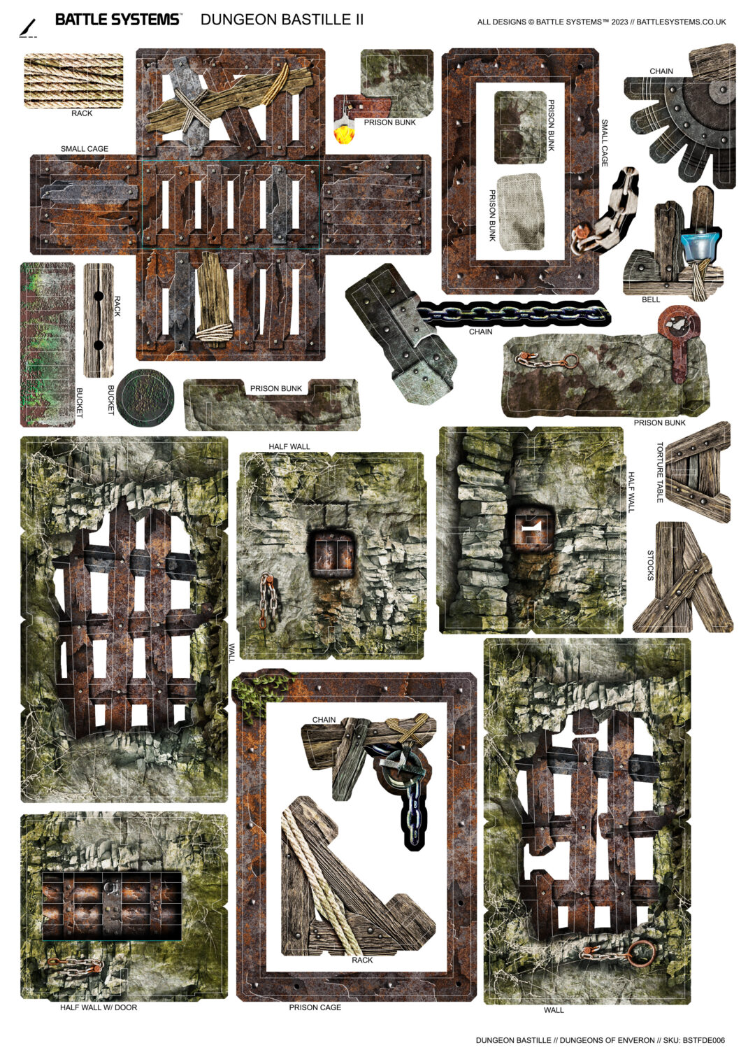 This pack expands your dungeon with prison and torture chamber themed terrain, from walls and doors fitted with iron bars, to alarm bells, chains, prison bunks, and a torture chamber complete with a rack. It works in conjunction with the rest of the Battle Systems Dungeon range.