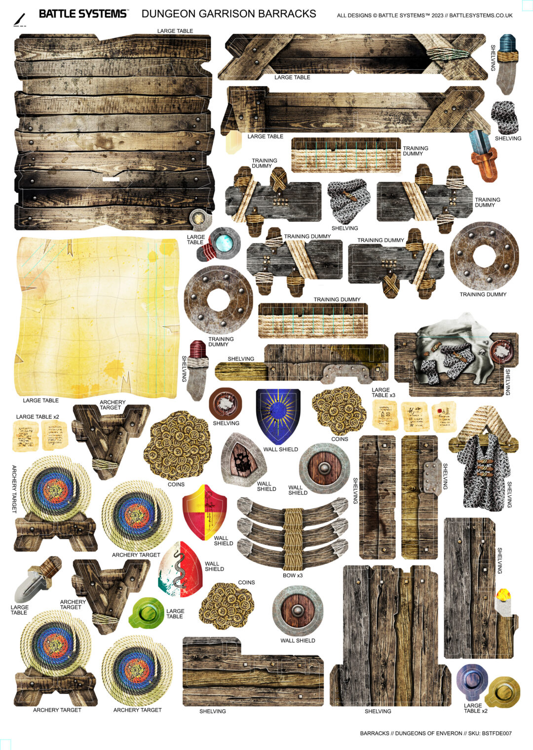 This pack will fully furnish a barracks, perfect for your troops to rest, train and strategise between battles. It includes an armoury, war room, war cache, training room and sleeping quarters. It works in conjunction with the rest of the Battle Systems Dungeon range.
