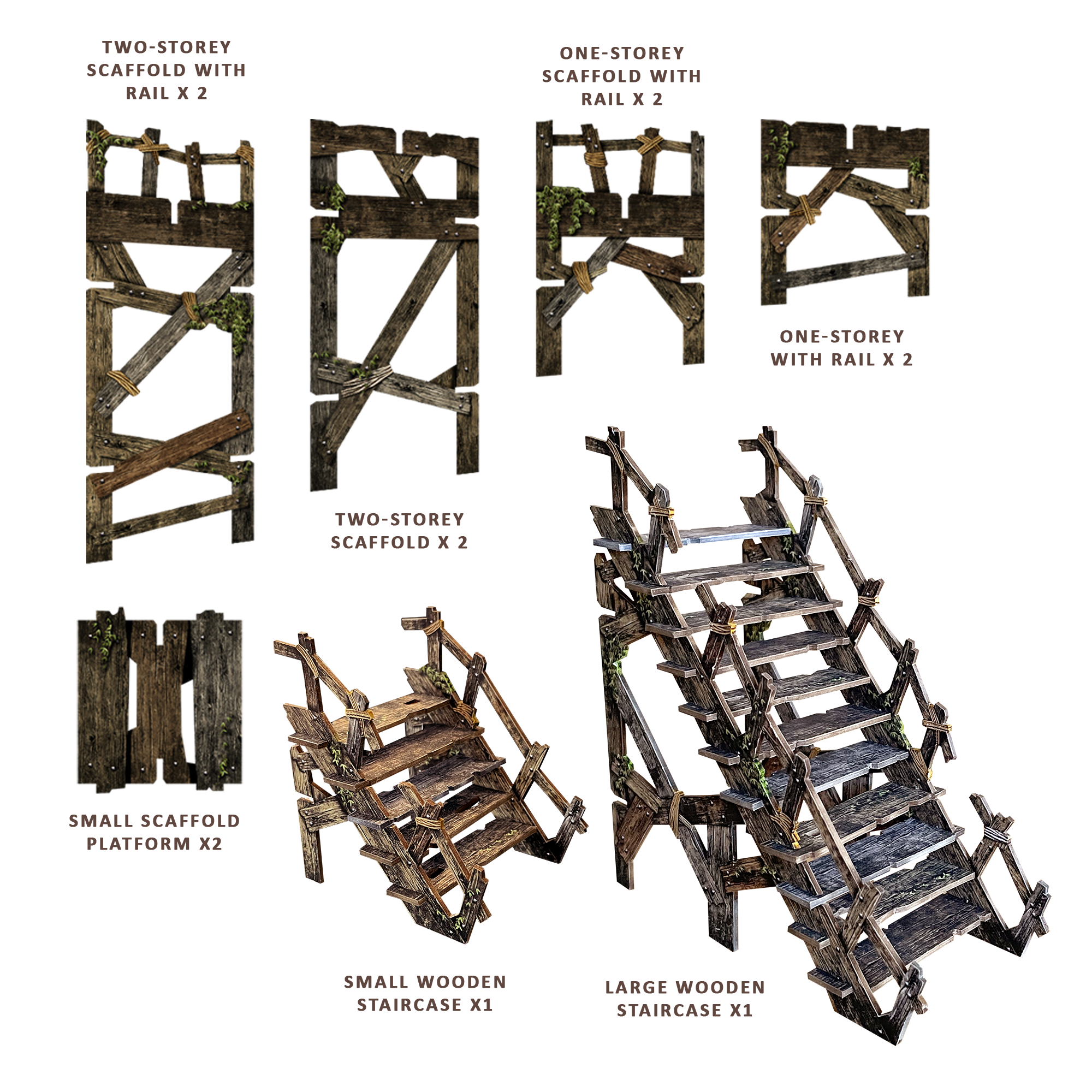 This pack contains additional scaffolding from the Fantasy Dungeon terrain set for building larger gaming areas.