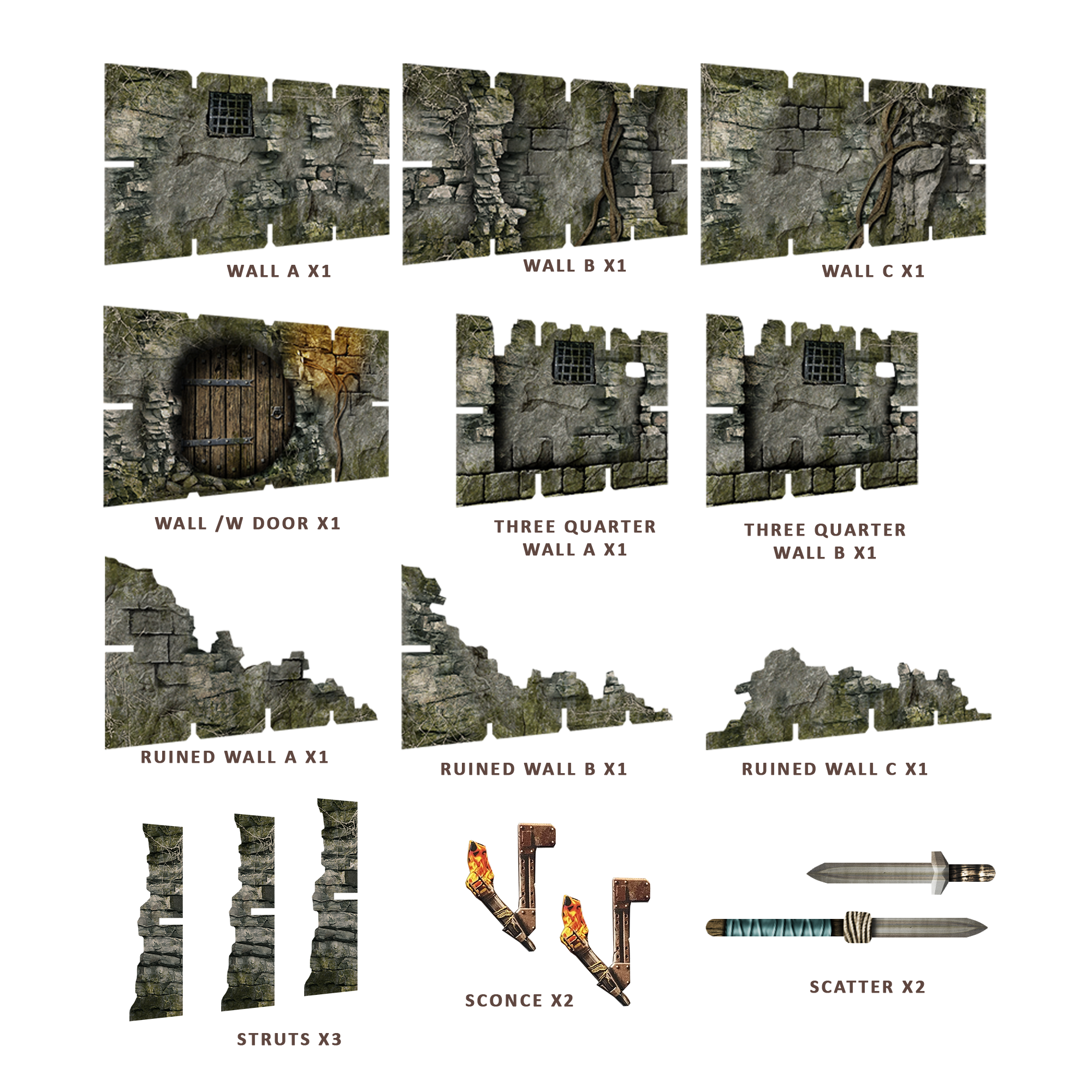This pack contains additional walls from the Fantasy Dungeon terrain set for building larger gaming areas.