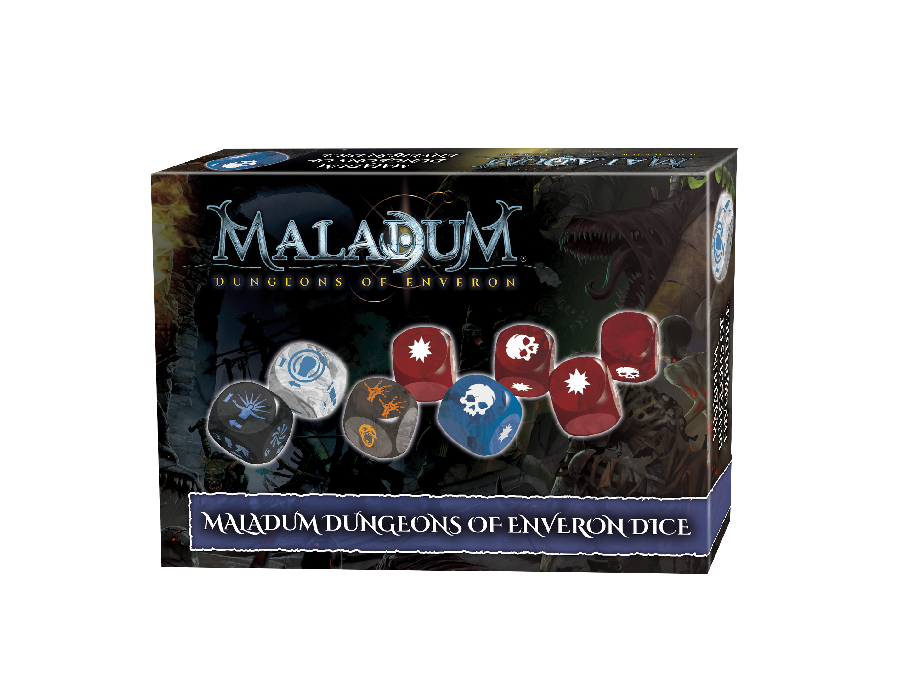 This booster pack for Maladum contains a set of eight pearl-effect custom moulded dice just like the ones in the starter set, as well as a Forbidden Magic Die.