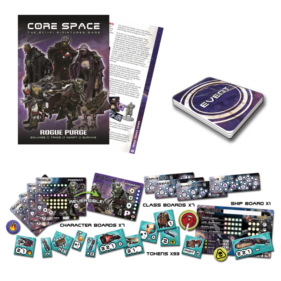 What happens when the Purge disconnect from their masters? Resisting their conditioning and trying to blend in as humans, the new Rogue Purge NPCs may not be hostile at first but the time will come when they know too much! They can also be fielded as a Trader crew, with a unique new ability to craft their own equipment from its component parts, presenting plenty of new decisions about what to grab on a salvage run. Watch and learn about them in a series of thrilling new missions, and then add them to your regular games with the new Event Cards, useful Lock Counters, and wide range of new equipment.