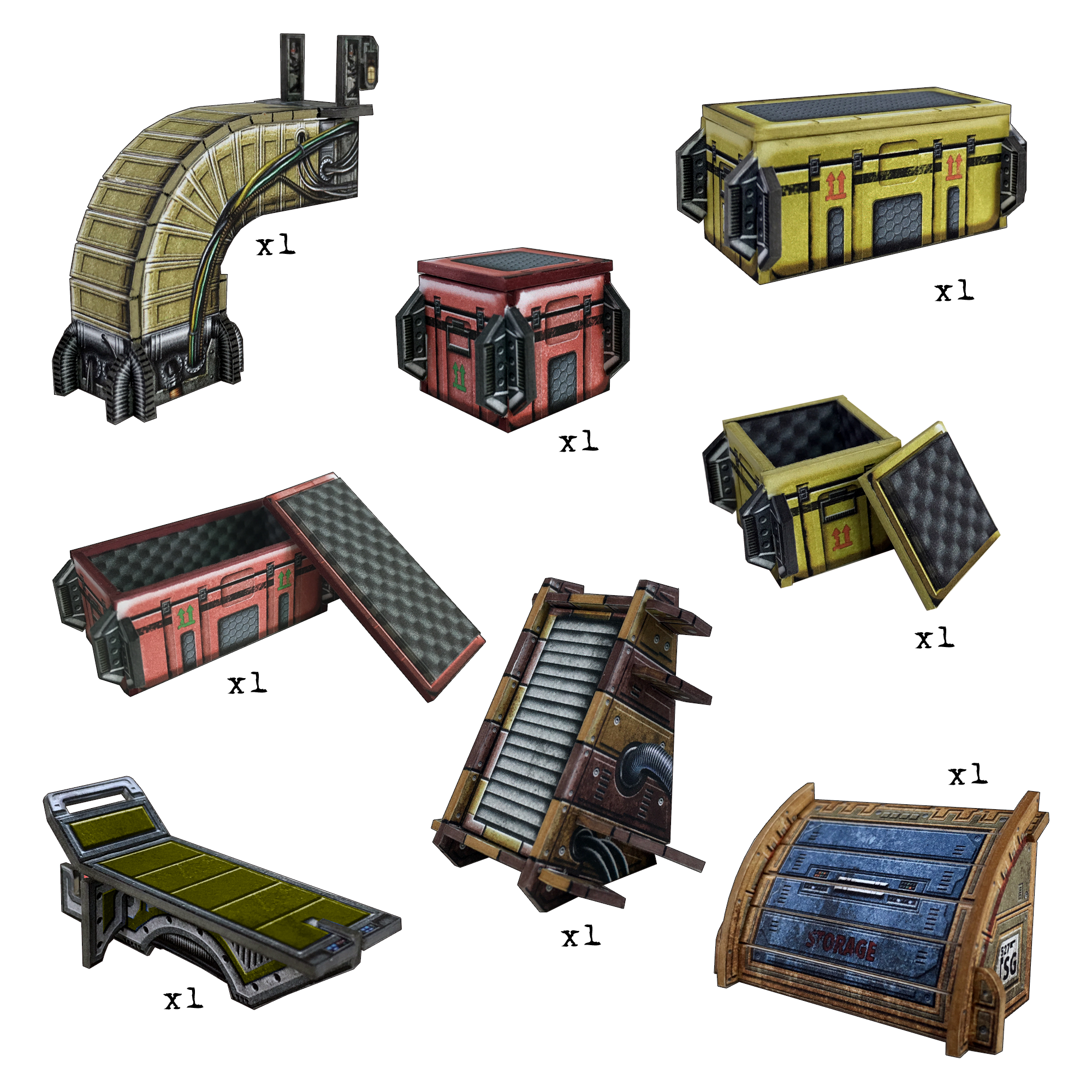This pack contains additional sci-fi crates and accessories for building larger gaming areas.