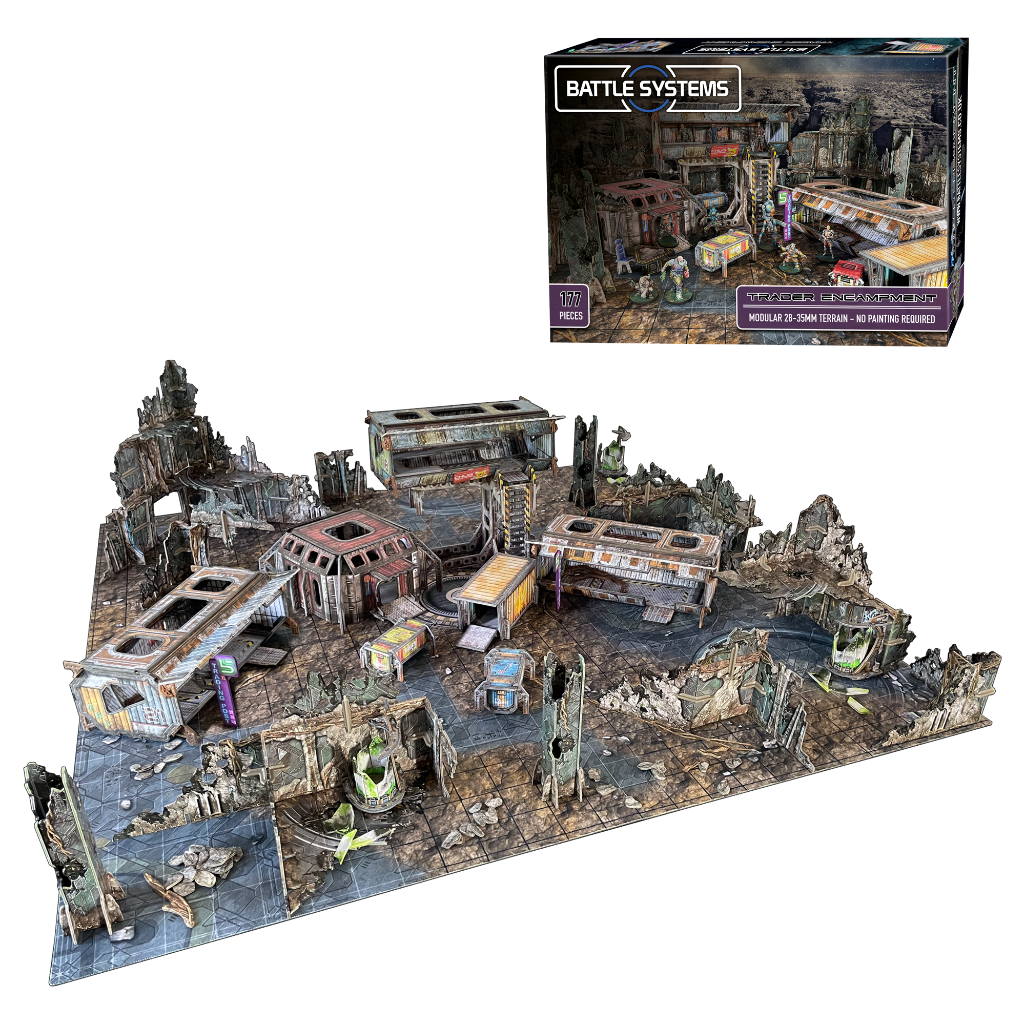 The terrain is supplied flat-packed on high-quality, high-density card, printed in full colour on both sides, so no painting required! The terrain requires assembly, and some smaller parts will require glue. Please see www.battlesystems.strafe.dev for more details and full instructions.