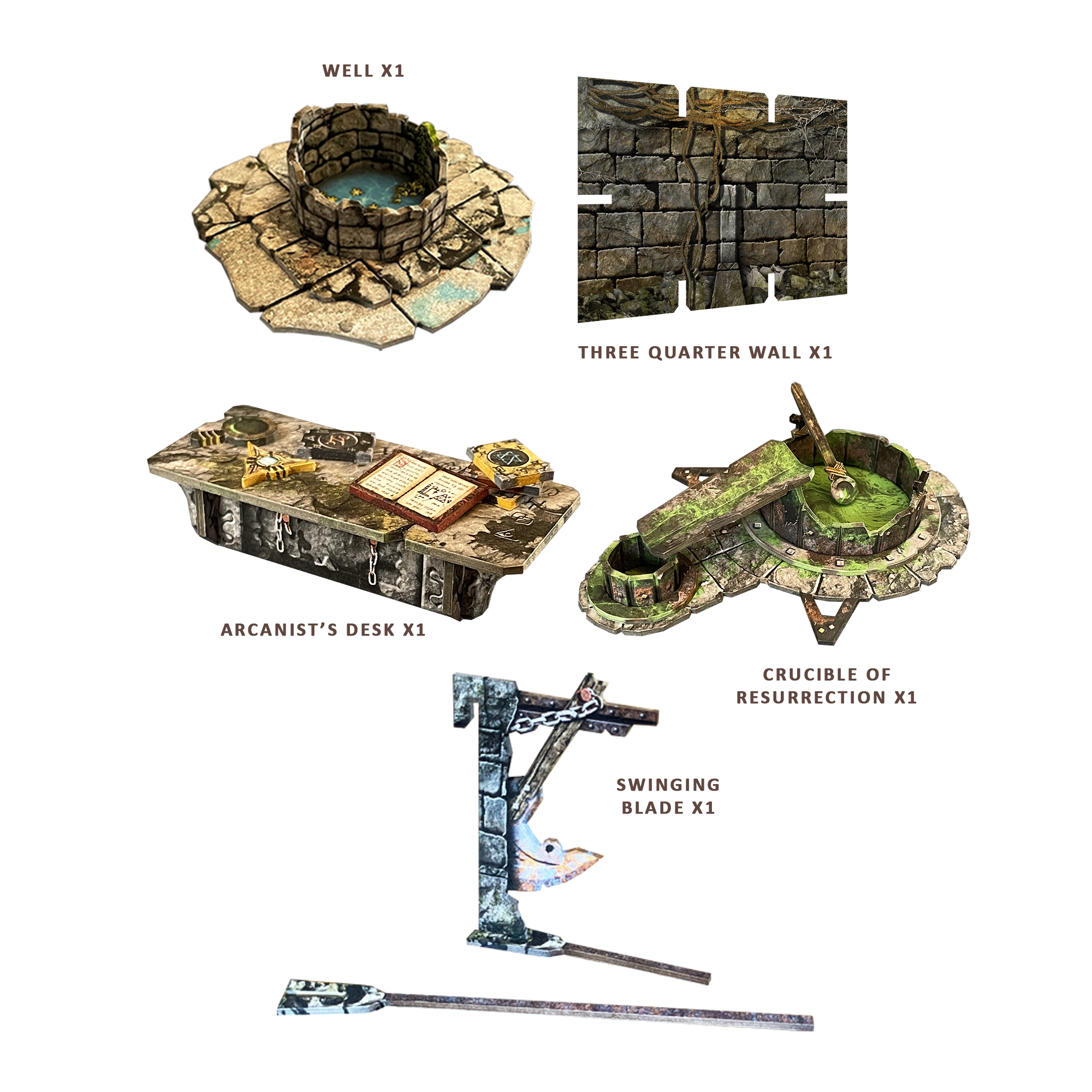 This pack contains additional accessories from the Vaults of Enveron terrain set (also included in the Maladum Starter Set) for building larger gaming areas.